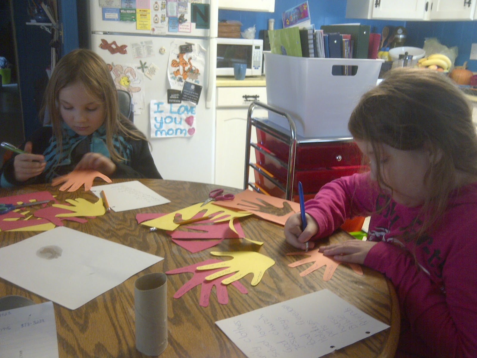 I needed a quick craft to do for this week, so we decided on doing these turkeys. They used a toilet paper tube for the body, and then traced their hands onto red, yellow and orange constructon paper. They wrote something they were thankful for on each finger and then cut them out and glued them onto the body. Then they decorated the faces how they wanted too.